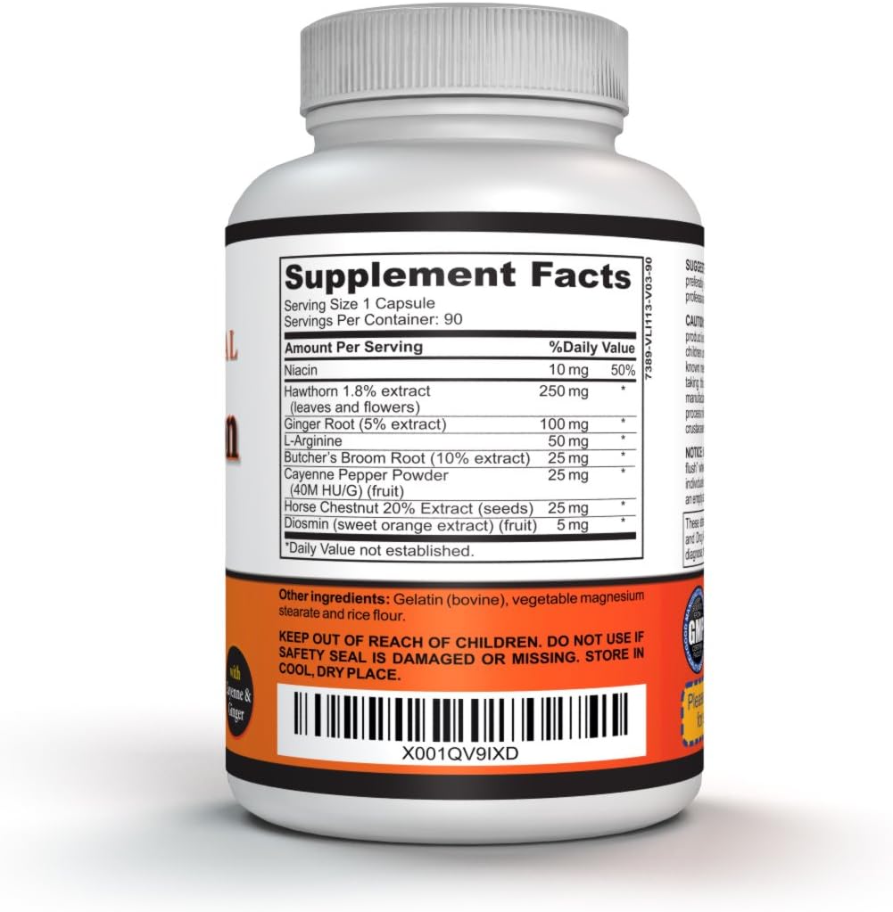 Niacin, 10 mg; Hawthorn 1.8% extract (leaves and flowers), 250 mg; Ginger Root (5% extract), 100 mg; L-Arginine, 50 mg; Butcher's Broom Root (10% extract), 25 mg; Cayenne Pepper Powder (40M HU/G) (fruit), 25 mg; Horse Chestnut 20% extract (seeds), 25 mg; Diosmin (sweet orange extract) (fruit), 5 mg; Other ingredients: Gelatin (bovine), vegetable magnesium stearate and rice flour.