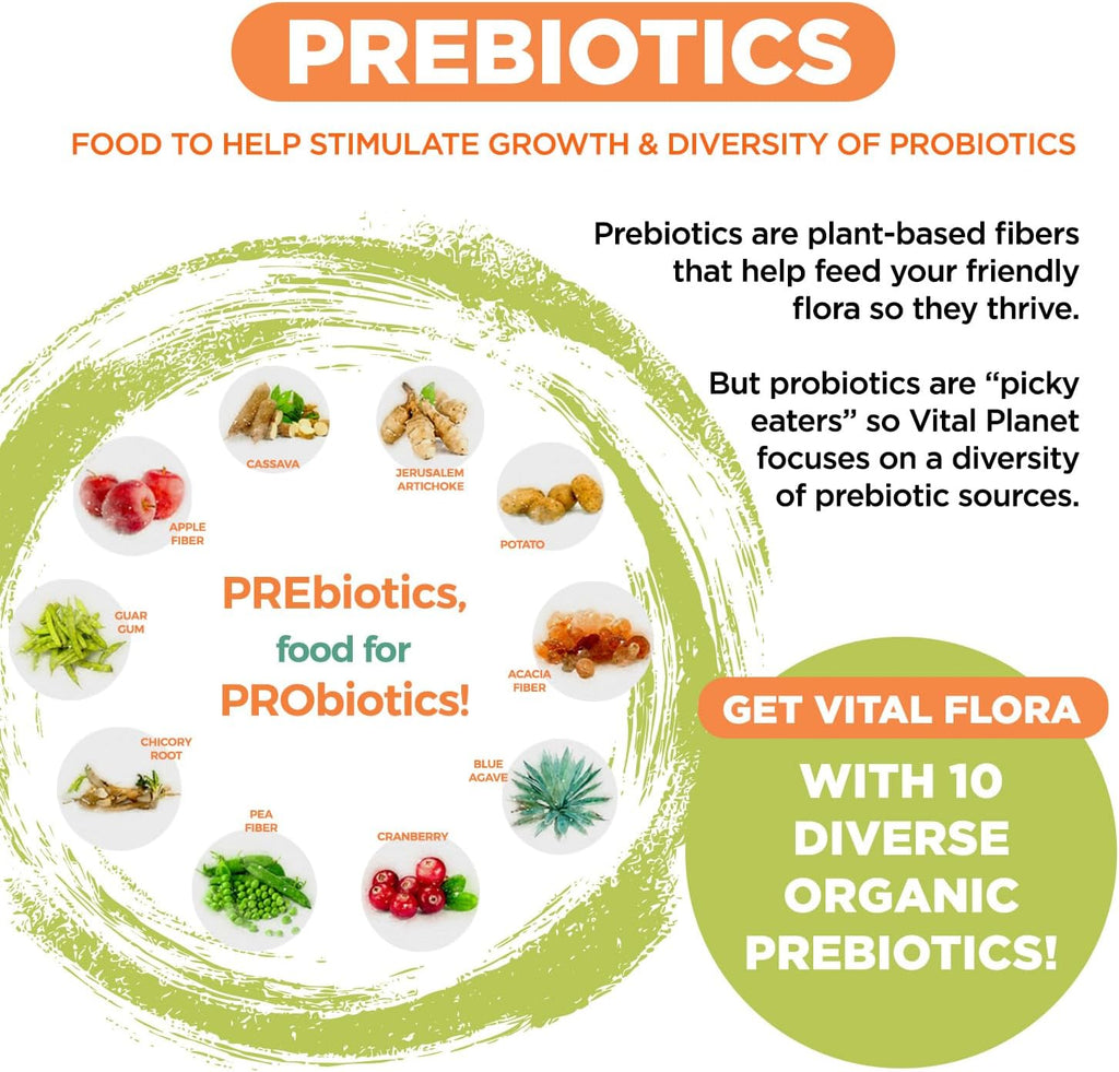 - Prebiotics – Food for Probiotics - Prebiotics are plant-based fibers that help feed good probiotics in the gut. But not all probiotics like the same food source. That’s why Vital Flora contains a diverse blend of 7 different organic whole food prebiotics.