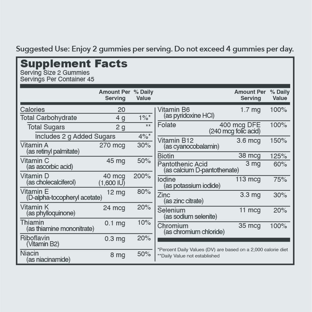 - One bite, Multiple Benefits ---- This multi-tasking multivitamin for women contains B Vitamins to boost daily energy, Vitamin C&Zinc, Selenium for immune health, Thiamin, Chromium, Iodine supports the metabolism.