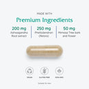 L-Theanine 100 mg, Phosphatidylserine 50 mg, Ashwagandha (Withania somnifera) root extract (4.5% withanolides) 200 mg, Relora® proprietary (Magnolia officinalis and Phellodendron amurense) bark extract blend 250 mg, Lemon balm (Melissa officinalis) aerials 50 mg, Mimosa tree (Albizia lebbeck) bark and flower 50 mg, Cordyceps (Cordyceps militaris) mushroom 50 mg, Vegetarian capsule (Hypromellose and water).