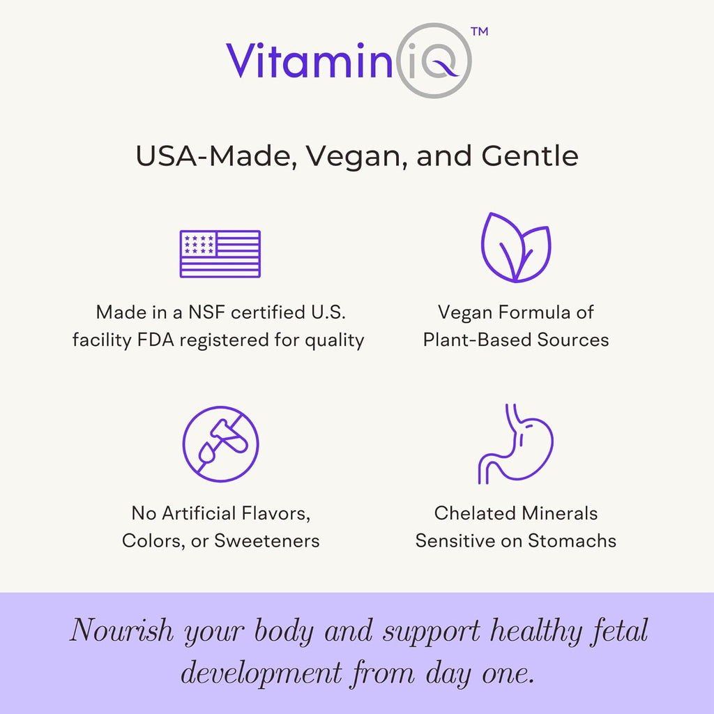 - Whole Food Prenatal Vitamin for Healthy Mom & Baby: For the right nutrition, early on, VitaminIQ’s Whole Food Prenatal is a daily prenatal multivitamin providing the unique nutritional needs essential to mommy and baby health. Moreover, we don’t use synthetic folic acid in our prenatal vitamins – instead, we use folate and Methylated B found naturally in whole foods for better absorption that’s essential for healthy neural tube and brain development in infants.