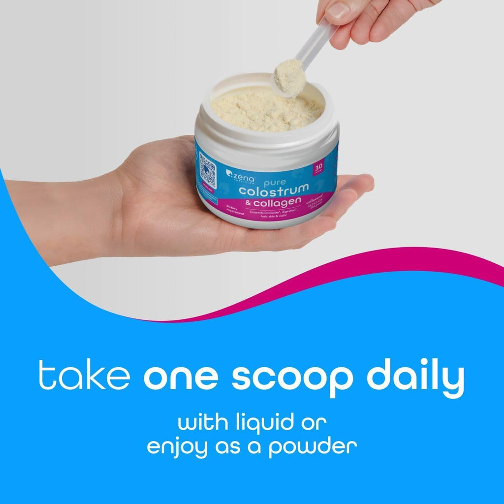 Zena Nutrition Pure Colostrum and Collagen Powder Supplement is an advanced formula that combines Collagen Peptides with pure Colostrum to help nourish your hair, skin, and nails and support your immunity & digestion.