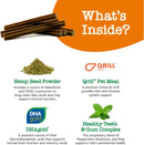 Active: Hemp Seed Powder 280 mg Qrill™ Pet Meal 135 mg Healthy Teeth & Gum Proprietary Blend (Kelp, Peppermint Oil, Rosemary Extract) 55 mg DHAgold® (Schizochytrium sp. algae) 50 mg Taurine 10 mg. Inactive: Apple Pomace, Bone Broth Powder, Brewer's Yeast, Chickpea, Citric Acid, Coconut Glycerin, Lactic Acid, Salmon, Sorbic Acid, Tapioca Flour